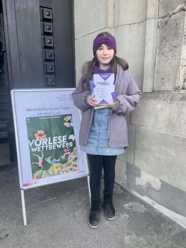 Am 19.2. hat Helena Kulmann aus der Klasse 6e unsere Schule beim Regionalwettbewerb Nord-West des Vorlesewettbewerbs vertreten. Insgesamt 19 Schülerinnen und Schüler aus dem Bremer Norden und Westen hatten sich am Nachmittag im Wallsaal der Stadtbibliothek Bremen versammelt, um aus ihren Büchern vorzulesen. Mit ihrem souveränen Vortrag konnte Helena die dreiköpfige Jury überzeugen! Sie ist eine von drei Schülerinnen aus dem Nordwesten, die beim Bremer Landesfinale vorlesen werden. Der bzw. die Gewinnerin des Landesfinales fährt nach Berlin zum Bundesfinale- wir wünschen Helena für die nächste Runde viel Erfolg und drücken ihr die Daumen!