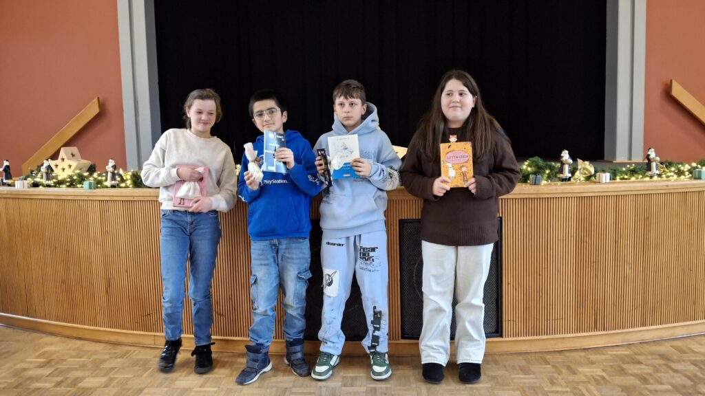 Im Anschluss an den offiziellen Vorlesewettbewerb führte unsere Schule noch einen internen Wettbewerb für Sprach – und Leseanfänger durch. Auch hier konnten uns Leon, Lea, Yasin und Mariam mit witzigen Geschichten begeistern und ernteten viel Lob für ihre gelungenen Vorträge.